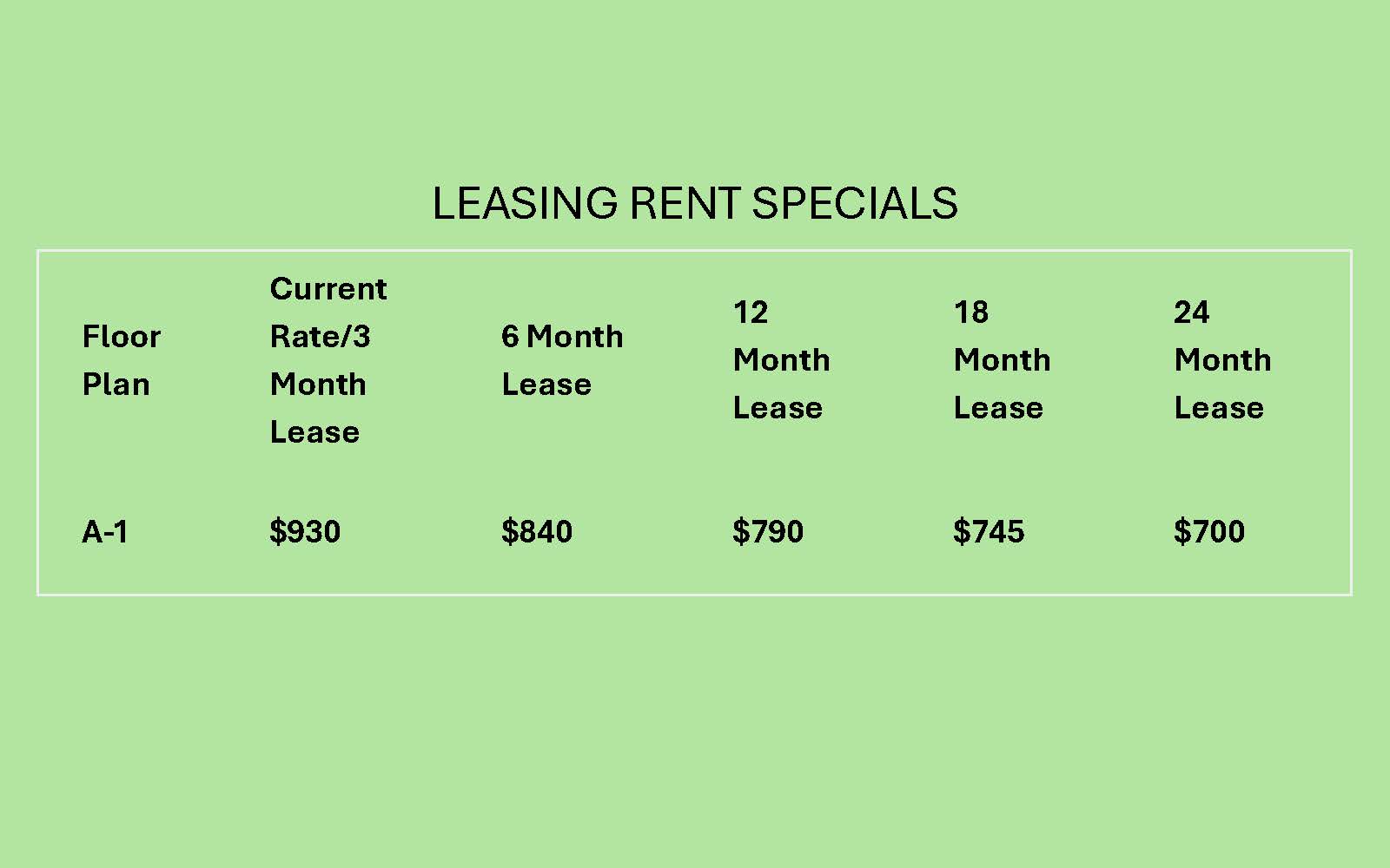 Please note that rental rates, availability, deposits, and specials are subject to change without notice and are based on availability. Lease terms vary and minimum lease terms and occupancy guidelines may apply. Please contact the leasing office for details.